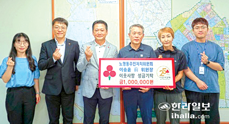 이승윤 전 노형동주민자치위원회 위원장은 지난 7일 노형동주민센터에서 이웃사랑 성금 100만원을 제주사회복지공동모금회(회장 강지언)에 기탁했다.