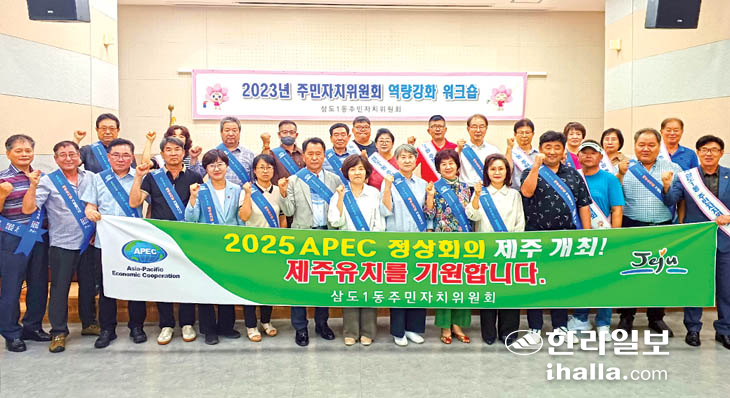 제주시 삼도1동주민자치위원회(위원장 윤용팔)는 지난 7일 삼도1동 주민센터에서 위원 28명이 참석한 가운데 2023년 주민자치위원회 역량강화 워크숍을 개최하고, 2025 APEC 정상회의 제주 유치 지지 결의문을 채택했다.
