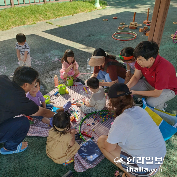 | 놀이터에서 또래, 부모와 다양한 놀이를 하며 노는 아이들. 사진은 제주도육아종합지원센터가 지역 놀이터에서 진행 중인 '우리들의 놀이터전 찾기 - 놀아보jam(잼)' 모습. 사진=제주도육아종합지원센터 |