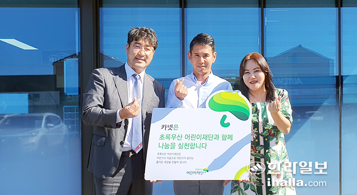 제주시 봉개동에 위치한 중고차전문점 카넷(대표 김종철)은 지난 11일 초록우산 어린이재단 제주후원회와 제주지역본부가 진행하는 나눔릴레이 캠페인에 동참했다. 이번 캠페인에서는 도내 아동 후원에 동참하는 약속으로 나눔현판 전달식이 진행됐다.