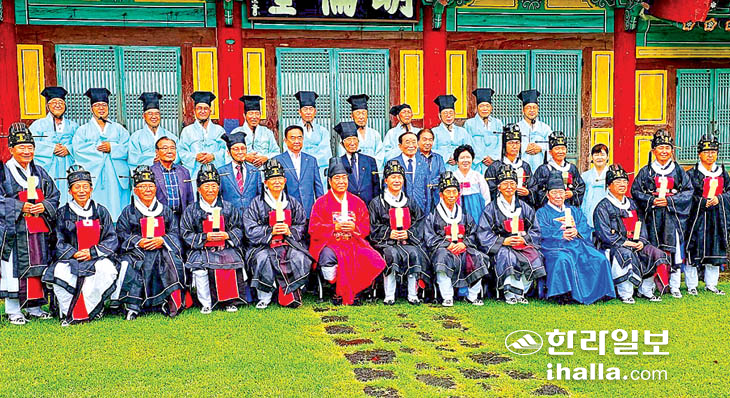 제주향교(전교 진인수)는 지난 16일 제주향교 계성사와 대성전에 성현선인들께 추기석전 분향례를 봉행했다. 대성전은 공부자를 비롯해 대설위 향교이기 때문에 39위를 모시고 있으며 계성사는 오성인의 선친을 모시고 있다. 이날 송재호 국회의원 비롯해 세계자연유산본부 김희찬 본부장이 참석해 김경남 향교 총무수석에게 공로 표창장을 수여했다.