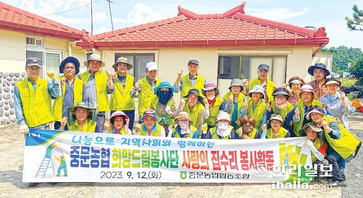 중문농협(조합장 김성범) 희망드림봉사단(회장 한재범) 회원 40여명은 지난 12일 지역 내 노후화된 주거환경을 가진 고령 농업인 가정을 찾아 집수리 봉사활동을 전개했다.