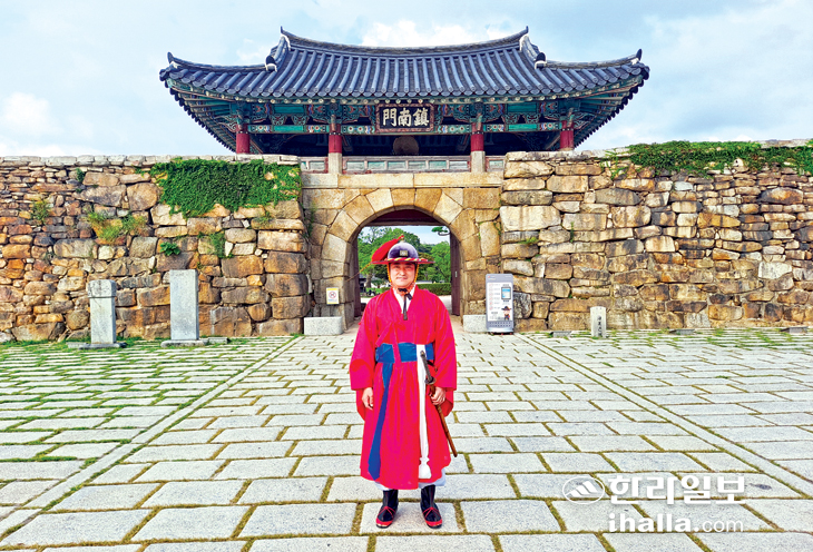 가장 먼저 마주한 곳은 진남문. 성내를 출입하는 주요 통로로, 다듬어진 돌로 된 아치형 홍예문이다. 이곳에서 수문장 1명이 2015년부터 굳건하게 자리를 지키고 있다.