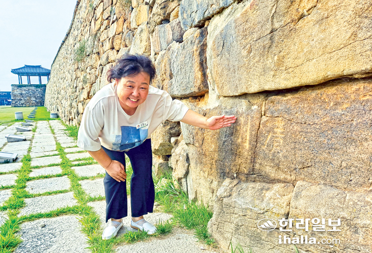 | 축성 당시 지역별 실명제를 설명하는 김재신 문화해설사. 백금탁기자 |
