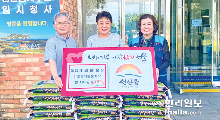 서귀포시 성산읍 신양리에 거주하는 최윤순씨는 지난 15일 성산읍사무소를 방문해 어려운 이웃을 돕기 위한 쌀 10㎏ 30포를 기탁했다. 최씨는 앞서 지난해 11월에는 공병을 팔아 모은 돈을 기탁한 바 있다.