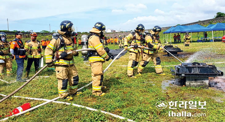 서부소방서(서장 고정배)는 지난 19일 서귀포시 대정읍 신도리 소재 저류지 일대에서 전기차량 사용 후 폐배터리 이용 실물화재 교육 훈련을 실시했다. 훈련은 전기차 화재 발생 유형별로 재현해 관찰하며 이뤄졌다.