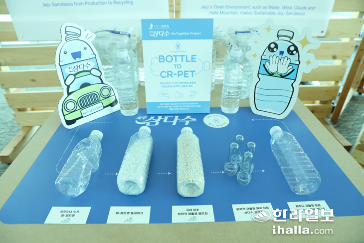 특히 제주삼다수는 이번 제주물 세계포럼을 통해 해중합 국산화 원료를 적용한 '보틀 투 CR-삼다수' 제품을 최초로 공개했다. '보틀 투 CR-삼다수'는 제주도에서 수거한 폐페트병을 화학적 분해를 통해 만든 재생 페트 제품으로, 국내 최초로 국내에서 수거된 페트를 활용해 제작한 CR-PET(화학적 재활용 페트)다.