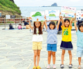 | 23일 서귀포시 안덕면 사계리 용머리 해안 일대에서 진행된 제1회 제주바다그리기 대회 참가자들이 완성한 그림을 들고 포즈를 취하고 있다. 이상국기자 |