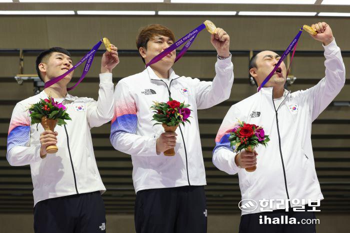 26일 중국 항저우 푸양 인후 스포츠센터에서 열린 제19회 항저우 아시안게임 남자 10m 러닝타깃 혼합 단체전에서 금메달을 딴 한국 곽용빈(왼쪽부터), 정유진, 하광철이 시상대에 올라 메달을 들어 올려 보이고 있다. 연합뉴스