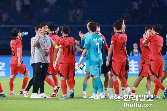 27일 중국 저장성 진화 스포츠센터 스타디움에서 열린 2022 항저우 아시안게임 남자축구 16강전 대한민국과 키르기스스탄의 경기. 5-1 대파 후 8강 진출을 이끈 황선홍 감독이 선수들을 격려하고 있다. 연합뉴스