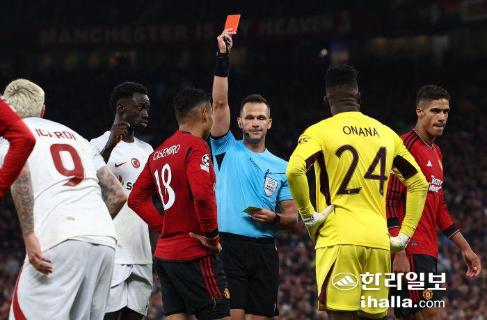 4일 열린 2023-2024 UEFAUCL 조별리그 A조 2차전 갈라타사라이와의 경기에서 퇴장 당하는 맨유 카세미루. 연합뉴스