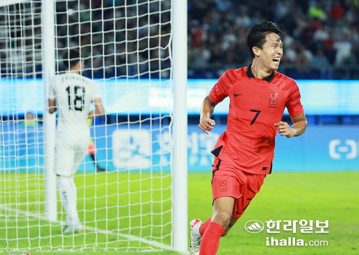 4일 중국 항저우 황룽 스포츠센터 스타디움에서 열린 2022 항저우 아시안게임 남자축구 4강전 대한민국과 우즈베키스탄의 경기. 두번째 골을 넣은 정우영이 환호하고 있다. 연합뉴스