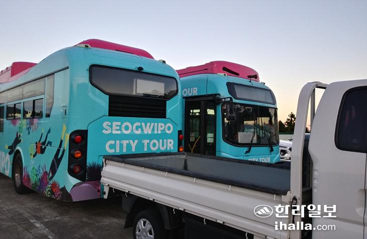 [한라일보] 지난 4일 오후 서귀포시 토평동에 있는 서귀포시 공영버스 차고지 겸 전기차 충전소. 파란 제주 바다를 유영하는 해녀들이 그려진 '서귀포 시티투어' 전기버스 4대가 고장 난 채 세워져 있었다.