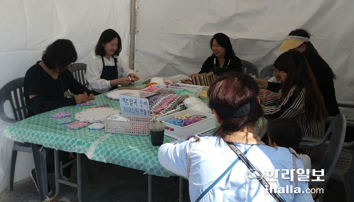 | 산방산·용머리해안 지질트레일 행사장 부스에서 못 쓰는 양말을 활용한 양말목 공예 체험이 이뤄지고 있다. |