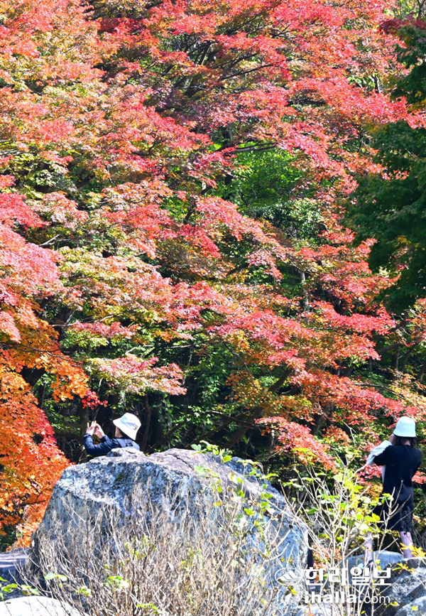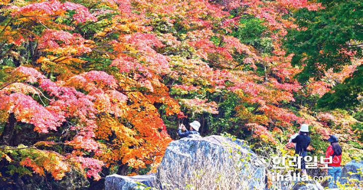 [한라일보] 26일 제주 단풍 명소의 한 곳으로 꼽히는 한라산 천아계곡을 따라 울긋불긋한 단풍이 절정을 이루면서 관광객과 도민들이 사진에 담고 있다. 한라산의 단풍은 이번 주말 절정을 이룰 것으로 예상되고 있다. 이상국기자