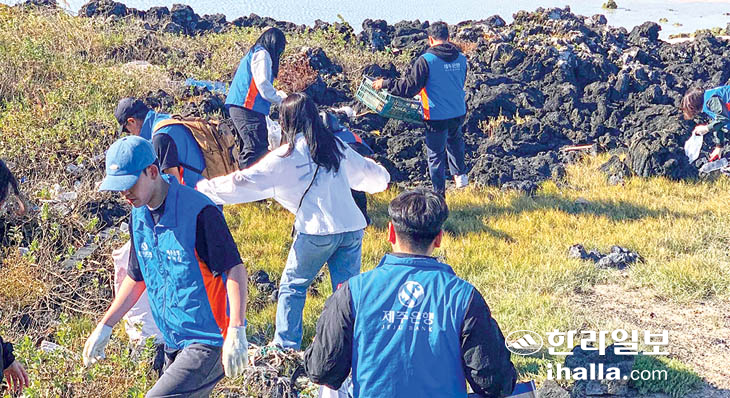 제주은행 4지역본부(화북금융센터, 이도지점, 아라지점, 성산지점, 표선지점) 직원 50여명은 최근 김녕 해수욕장과 해안가에서 플로깅 활동을 전개했다.