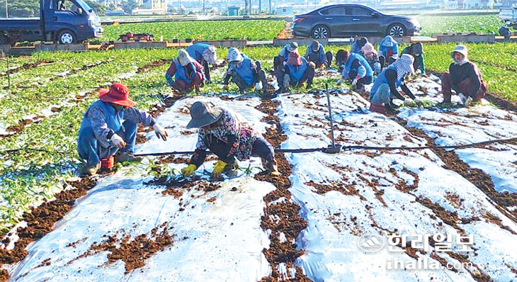 제주고산농협 여성조직 고향주부모임(회장 이옥자)은 지난달 30일 고산농협 임직원 및 회원 25명이 참여한 가운데 대사니마늘 기계화 재배 시범포 실증사업 운영 농지에서 마늘 유인작업(마늘종자 비닐밖으로 내치기)을 실시했다. 고산농협은 시범포 운영을 여성농업인 단체인 고향주부모임에서 위탁 운영하고 있다.