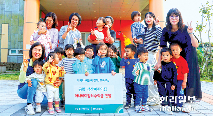 서귀포시 성산읍에 소재한 공립성산어린이집(원장 한수진)은 지난달 31일 어려운 이웃을 돕는데 써달라며 원아와 교직원이 직접 아나바다 장터를 통해 마련한 수익금과 성산LH아파트 경로당 홍순표 회장이 지원한 후원금을 합쳐 총 44만5500원을 초록우산 어린이재단 제주지역본부(본부장 변정근)에 전달했다.