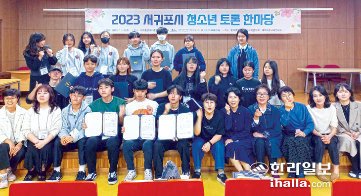 서귀포시와 (재)서귀포시교육발전기금(이사장 현봉식)이 공동 주최하고 혼디모영토론교과교육연구회·제주토론교육연구소가 주관한 2023 서귀포시 청소년 토론 한마당이 지난 4일 서귀중앙여중에서 열렸다. 이날 행사에는 관내 중학생 9교 21팀 63명(3인 1팀)이 참가했다. 금상은 서귀포중학교 '와이드포커스', 은상은 서귀포여자중학교 '가람', 동상은 서귀포중학교 '페네트로'와 표선중학교 '반박불가' 팀이 각각 수상했다.