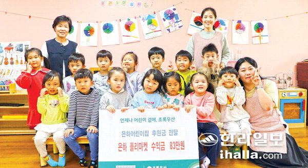 제주시 조천읍에 소재한 은하어린이집(원장 이기열)은 지난 2일 어려운 이웃을 돕는 데 써달라며 원아 가족과 교직원이 직접 플리마켓을 통해 마련한 수익금 83만원을 초록우산 제주지역본부(본부장 변정근)에 전달했다. 행사를 통해 마련된 수익금은 제주도내 어려운 아동 가정에 지원될 예정이다.