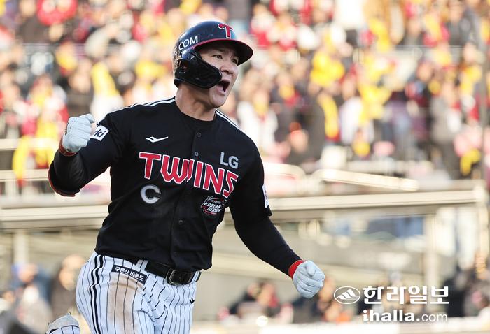 11일 경기도 수원케이티위즈파크에서 열린 2023 KBO 한국시리즈 4차전 LG 트윈스와 kt wiz의 경기. 7회초 1사 주자 1, 3루에서 LG 오지환이 홈런을 치고 기뻐하고 있다. 오지환은 한국시리즈 3경기 연속 홈런을 쳤다. 연합뉴스