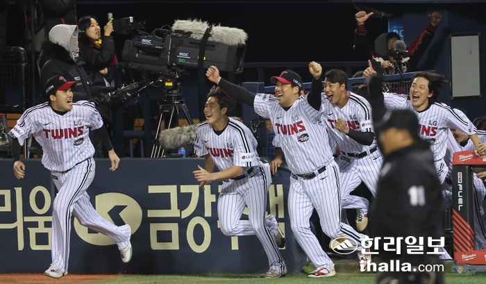 13일 서울 잠실야구장에서 열린 2023 KBO 한국시리즈 5차전 kt wiz와 LG 트윈스의 경기.kt에 승리하며 한국시리즈 우승을 확정한 LG 선수들이 기뻐하고 있다. 연합뉴수