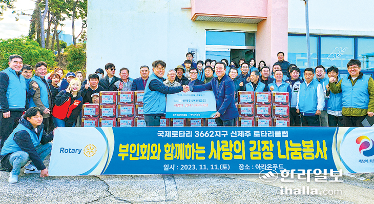 국제로타리3662지구 신제주 로타리클럽(회장 강주행)은 지난 11일 제주시 도두동 아라온푸드에서 '사랑의 김장나눔' 행사를 진행하고 김장김치 1300㎏를 초록우산 제주지역본부(본부장 변정근)에 전달했다.