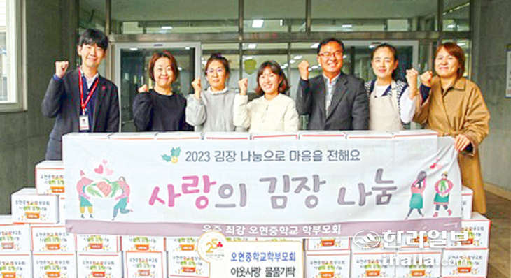 오현중학교 학부모회(회장 김진아)는 지난 10일 제주시 오현중학교 급식실 앞에서 지역사회 어려운 이웃을 위한 김장김치 150㎏을 제주사회복지공동모금회(회장 강지언)에 기탁했다.