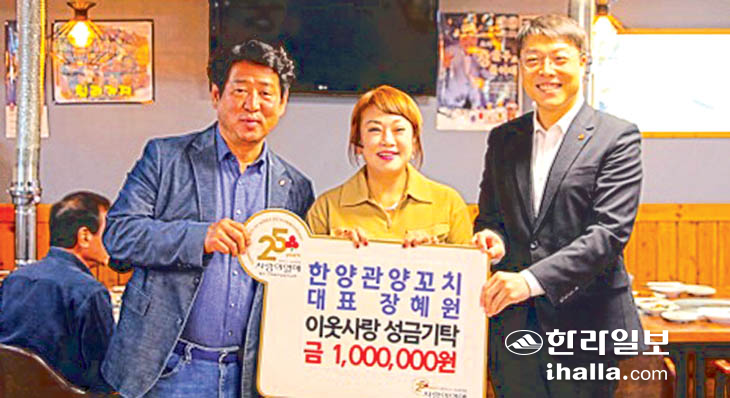 제주시 이도2동 소재의 한양관양꼬치 장혜원 대표는 지난 11일 한양관양꼬치 매장에서 지역사회 어려운 이웃들을 위해 사용해 달라며 나눔리더 성금 100만원을 제주사회복지공동모금회(회장 강지언)에 기탁했다.