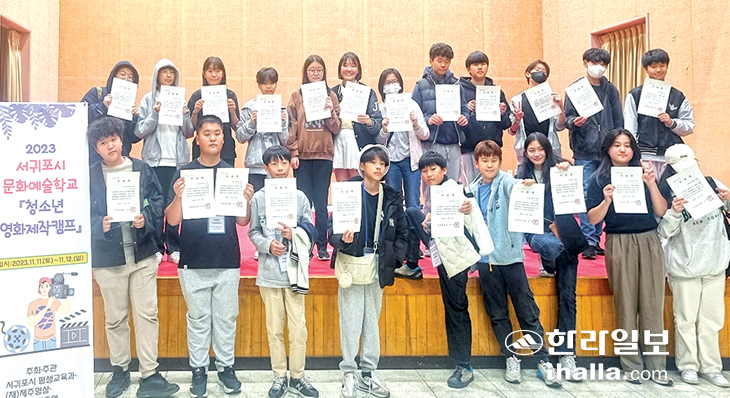 서귀포시는 지난 11일, 12일 양일간 서귀포시 평생학습관에서 관내 초·중학교 9교 23명이 참여한 가운데 2023 서귀포시 문화예술학교 일환으로 '청소년 영화 제작 캠프'를 운영했다. 이 프로그램은 영상 기획, 시나리오 작성, 야외 촬영, 영상 편집 교육과 실습, 영화 포스터 제작, 시사회 등으로 진행했다.