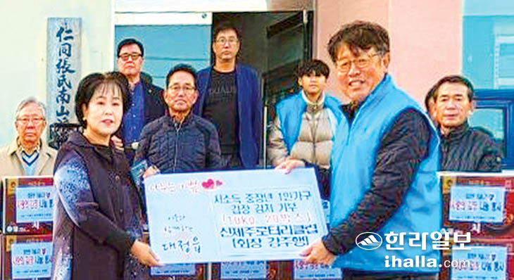 신제주라이온스클럽(회장 강주행)은 지난 11일 아라온푸드에서 사랑의 김장 김치 나눔 행사를 통해 서귀포시 대정읍(읍장 정미나)에 김장 김치 200㎏을 기탁했다.