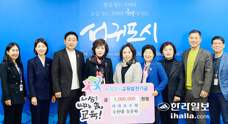 서귀포수협 수산대(대학장 김미자) 동문회는 지난 13일 서귀포시청 접견실에서 (재)서귀포시교육발전기금(이사장 현봉식)에 서귀포시교육발전기금 100만원을 기탁했다. 올해로 4기를 맞은 수산대학은 서귀포수협이 전문 수산인 양성을 위해 진행하는 교육프로그램의 하나이다.