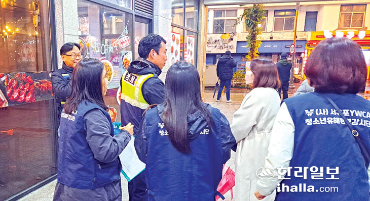 (사)서귀포YWCA 청소년유해환경감시단(단장 고맹수)은 지난 17일 서귀포시 중앙로 일대에서 서귀포경찰서와 연계해 청소년 유해 환경 점검과 단속, 청소년 보호 캠페인을 전개했다. 이번 캠페인은 수능 후 긴장함에서 해방된 청소년들의 일탈 행위를 예방하고 청소년 보호 의식 확산을 위해 마련됐다.