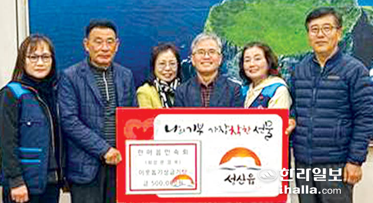 성산한마음민속회(회장 문경옥)는 최근 연말연시 불우이웃돕기 성금 50만원을 성산읍사무소에 기탁했다.