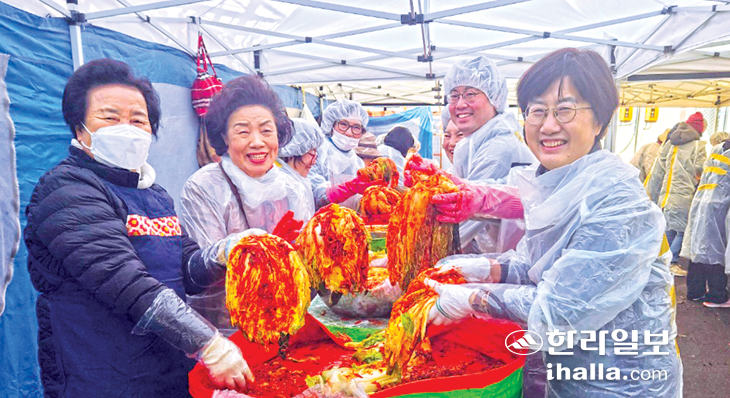 제주4·3희생자유족부녀회(회장 강능옥)는 지난 19일 제주시 오라동 남현김치 앞마당에서 김치 담그기 봉사를 진행했다.