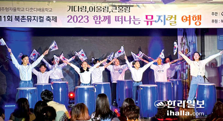 북촌초등학교(교장 강여임)는 지난 17일 다목적강당에서 전교생이 참여하는 '제11회 북촌 뮤지컬 축제 기다림, 큰울림 2023 함께 떠나는 뮤지컬 여행'을 개최했다. 북촌초는 2013년 예술꽃 학교를 시작으로 11년째 뮤지컬 교육과정을 운영해 오고 있다.