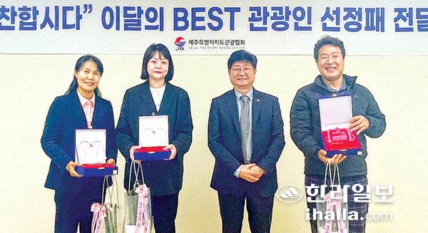 제주특별자치도관광협회(회장 직무대행 강인철)는 지난 17일 이달의 친절 베스트 관광인으로 피규어뮤지엄제주 김선미 관장, 제주난타 김효인 대리, 순풍해장국 강미옥 팀장 3명을 선정하고 상패를 전달했다.