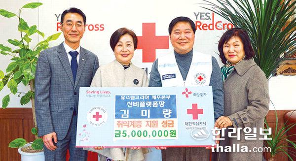휴스템코리아 제주본부 신비플랫폼장 김미량은 지난 20일 대한적십자사특별자치도지사(회장 정태근)를 방문해 취약계층 지원을 위한 성금 500만원을 기탁했다.