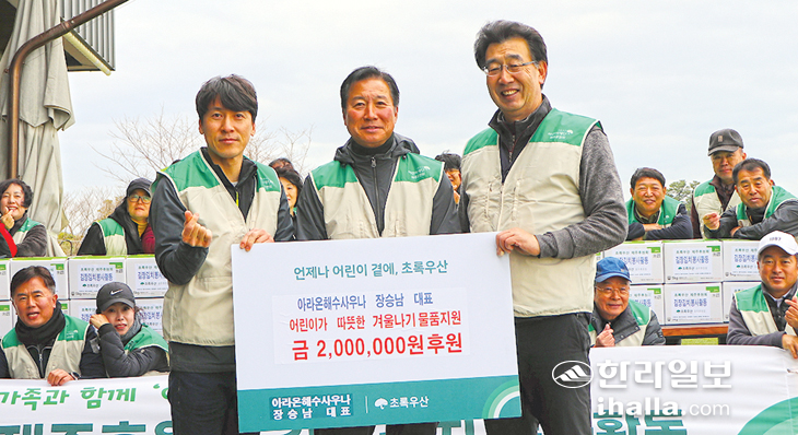 아라온 해수사우나(대표 장승남)는 최근 진행된 초록우산 제주후원회 김장김치 행사에 참여해 따뜻한 겨울나기 후원금 200만원을 초록우산 제주지역본부(본부장 변정근)에 전달했다.