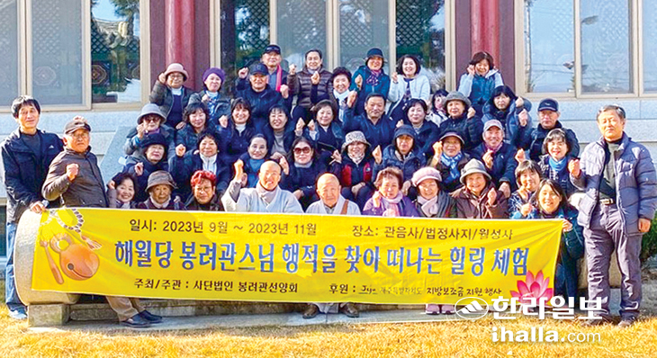 (사)봉려관선양회(이사장 김수진)는 지난 26일 제주시 고산 월성사에서 해월당 봉려관 스님 행적을 찾아 떠나는 힐링체험을 실시했다. 이날 체험은 참선 및 차, 걷기, 명상 등 다양한 프로그램이 진행됐다.