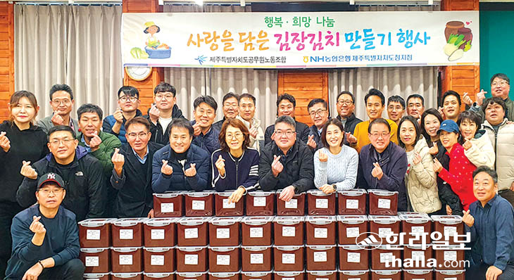제주특별자치도공무원노동조합(위원장 오태권)과 농협 도청지점(지점장 고형주)은 지난 25일 조합원과 가족 40여 명이 참여한 가운데 '사랑을 담은 김장김치 행복나눔 행사'를 개최했다.
