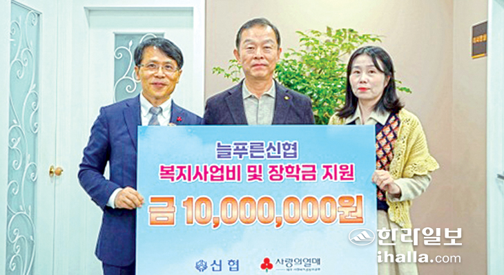 늘푸른신협(이사장 김정학)은 지난 24일 늘푸른신협 회의실에서 도내 사회복지기관 후원금 및 학생 장학금 지원을 위한 성금 1000만원을 제주사회복지공동모금회(회장 강지언)에 기탁했다.