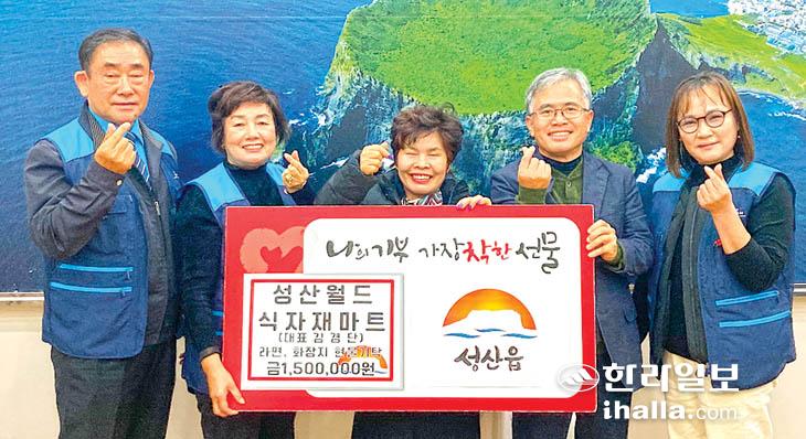 성산월드식자재마트(대표 김경단)는 지난 27일 서귀포시 성산읍(읍장 현동식)을 방문해 150만 원 상당의 라면과 화장지를 기탁했다.