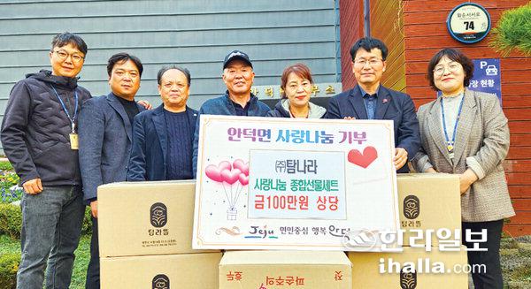 (주)탐나라(대표 한미경)는 지난 27일 서귀포시 안덕면사무소를 방문해 지역 내 저소득층 가정에 전달해 달라며 떡 등 100만 원 상당의 식품 세트를 기부했다.
