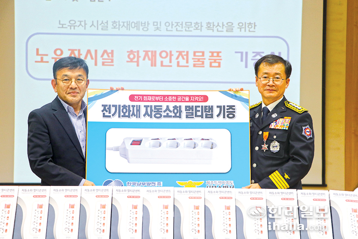 기증식을 통해 서귀포시 안덕면 소재 요양원, 어린이집 등 노유자시설에 자동소화 멀티탭 100개가 보급될 예정이다. 또 화재초기 대응요령 교육 및 전기용품 사용 시 주의사항 안내 등 안전교육도 함께 이뤄진다.