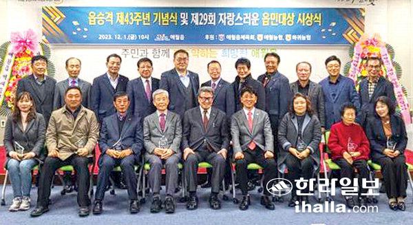 제주시 애월읍(읍장 김기완)은 지난 1일 애월읍사무소에서 제주도의회 의원, 재경애월읍민회, 제주시애월읍민회 관계자 등 100여 명이 참석한 가운데 읍승격 43주년을 기념해 '제29회 자랑스러운 읍민대상 시상식'을 개최했다.