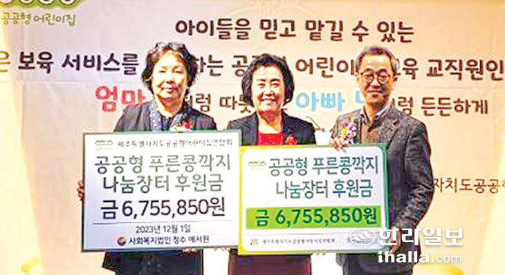 이날 학대피해 아동과 미혼모 가정을 위해 제주특별자치도 아동보호전문기관과 사회복지법인 청수 애서원에 '푸른 콩까지 나눔장터' 수익금을 각각 675만5850원씩을 전달했다.