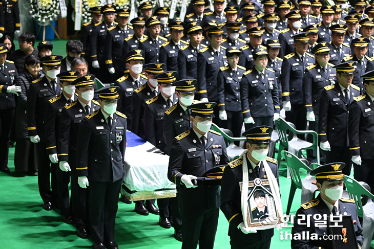 제주지역에서 화재를 진압하다 숨진 故 제주동부소방서 표선119센터 임성철 소방관(29·소방장)의 영결식이 유족과 동료들이 참석한 가운데 제주종합경기장 한라체육관에서 제주특별자치도장(葬)으로 엄수되고 있다. 이상국 기자