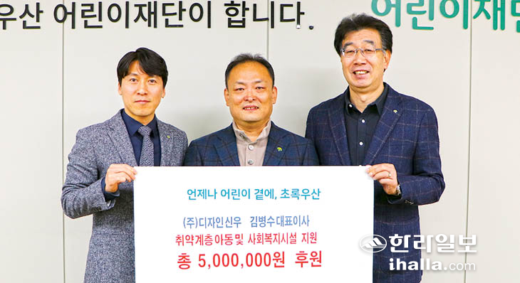 제주시 오라동에 위치한 (주)디자인신우 김병수 대표이사는 지난 6일 초록우산 제주후원회(회장 황금신)와 제주지역본부(본부장 변정근)가 진행하는 나눔릴레이 캠페인에 동참하고 아동가정 및 사회복지시설 지원금 500만원을 전달했다.