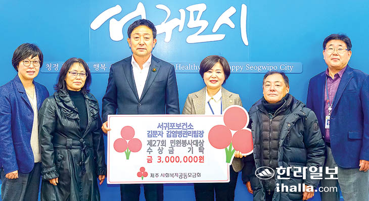 서귀포보건소 김문자 팀장은 제27회 민원봉사대상 본상을 수상해 받은 시상금 300만 원을 지난 5일 어려운 이웃을 위한 사랑의 성금으로 기탁했다. 해당 성금은 사회복지공동모금회를 통해 장애인 복지 향상을 위한 일에 지원될 예정이다.